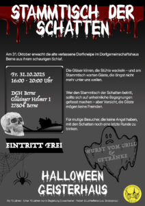 Wenn die Dunkelheit über Berne fällt, öffnet die verlassene Dorfkneipe ihre Türen – für all jene, die sich trauen. Der Stammtisch der Schatten ist kein gewöhnliches Treffen: Hier wandert man durch Räume voller Geheimnisse, begegnet längst vergessenen Gestalten und erlebt Halloween mit allen Sinnen.